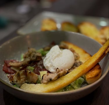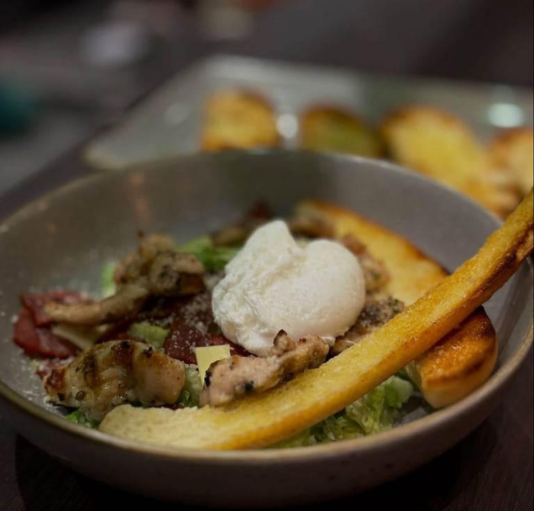 Romaine lettuce, homemade dressing, crispy bacon crumbs, cherry tomato, parmesan cheese, poached egg, slices chicken breast and garlic crouton sticks.