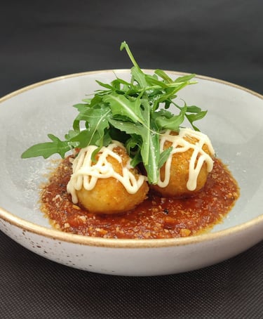 Chicken Risotto balls, rocket, parmesan cheese, napoletana sauce and kewpie mayo.